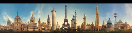 Famous landmarks of the world grouped together in front of blue sky