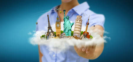 Young woman holding a cloud full of famous monuments of the world in his hands