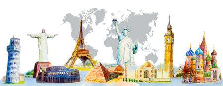 Famous monuments of the world illustrating the travel and holidays