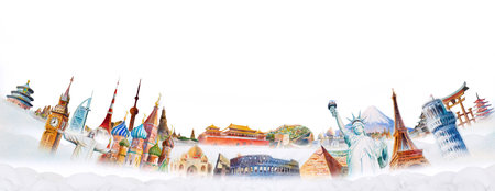 Travel landmarks world on group cloud, white background. Landmark architecture monuments of the world,Tourism with panoramic landscape for travel poster and postcard, Watercolor painting illustration.