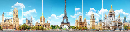 Collage showing famous world landmarks. High resolution image suitable for commercial use. Clear details and vibrant colors enhance visual appeal.