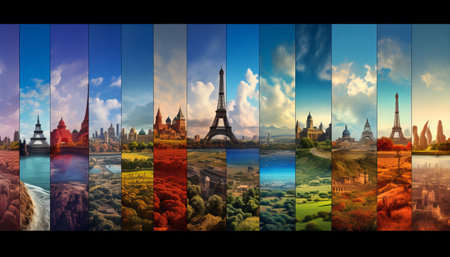 Collection of colorful travel postcards from iconic cities, Ai generated image