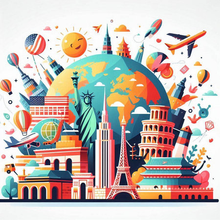 A vibrant illustration depicts famous world landmarks and travel icons arranged around a stylized globe. The Eiffel Tower, Leaning Tower of Pisa, Taj Mahal, Colosseum, Pyramids, Christ the Redeemer, and Statue of Liberty are prominently featured. Airplanes and hot air balloons dot the bright blue sky with fluffy clouds and a shining sun.