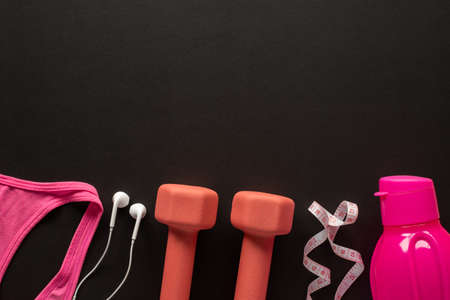 Dumbbells, measuring tape, water bottle, headphones and sportwear on black background. Fitness, sports and workout concept flat lay with copy space.