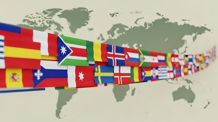 Multiple country flags form a banner on world map.