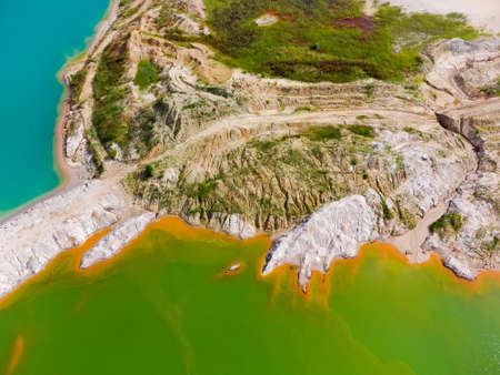 Colored lakes and old waste rock dumps on the site of the abandoned ilmenite quarry, aerial view