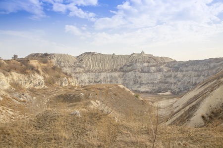 Sand-and-clay hills at a quarry: an autumn landscape under a blue sky