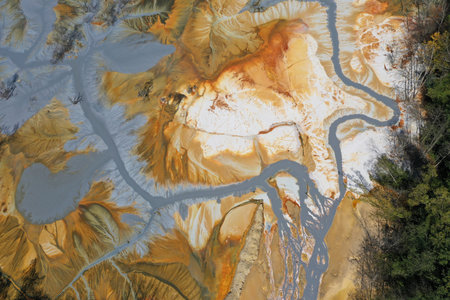 Aerial view of acid mine water drainage flow, toxic mine waters polluting the environment