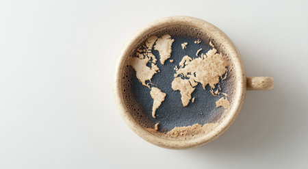 An overhead view reveals a coffee cup with a world map design within the beverage. The light brown and dark shades of the coffee create a visual contrast. The cup is set against a simple white background. This image could be used for various projects.