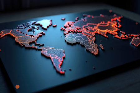 Close-up of a world map with highlighted continents, sharp lines and bright contrast