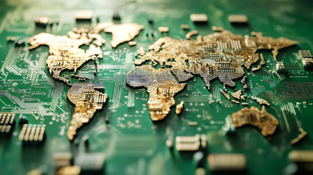 A world map formed from intricate circuit boards and chips reflects the blend of technology and global interconnectedness in today's society.