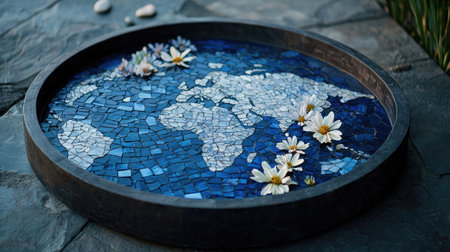 This beautifully crafted mosaic artwork showcases a world map in shades of blue, adorned with delicate flowers. Perfect for garden or indoor decoration.