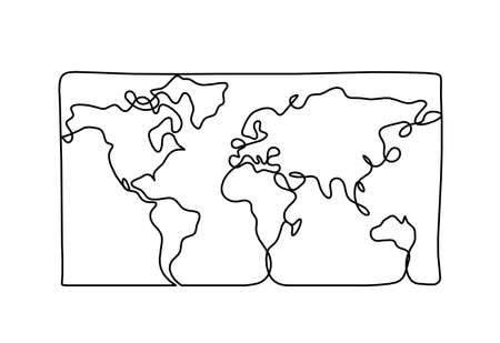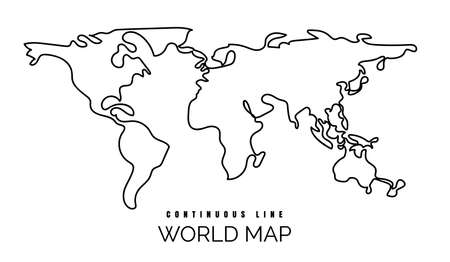 Continuous line world map illustration. Simple one line earth contour, vector monoline global map sketch, minimal linear map design, single outline drawing