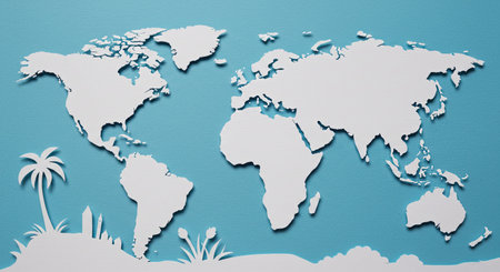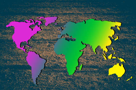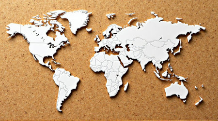 Fragments of a global map illustrate various countries and continents through detailed textures and colors, highlighting geographic diversity and boundaries.