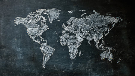 This chalk drawing of a world map on a dark blackboard surface serves as both an educational tool and an attractive decorative piece for classrooms or homes.