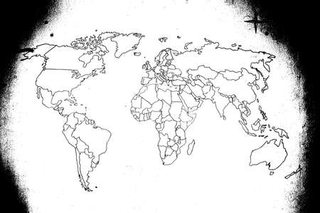 A stylized world map depicted in white against a textured tan background, highlighting global geography and cartography.