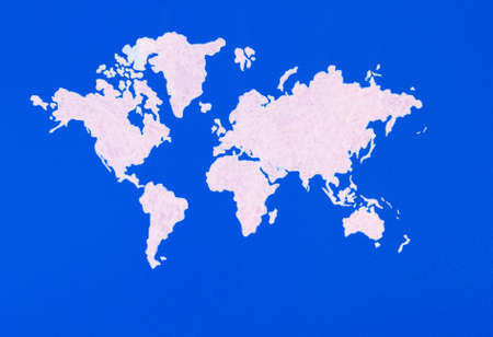 A colorful world map is cut out of a white background. The map is made of different colored pieces, and it looks like a puzzle. The colors of the map are red, blue, green, and yellow