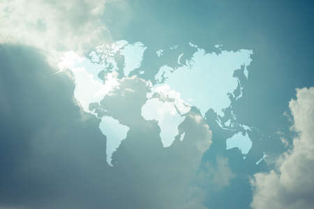 Nature cloudscape with blue sky and white cloud with world map , process in vintage style