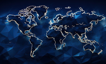 World map with illuminated network nodes, ideal for showcasing international business and tech
