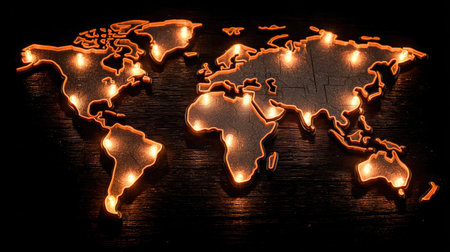 An illuminated world map silhouette glows with warm, orange light against a dark backdrop. The detailed map outline displays continents and countries with points of light. The composition highlights contrasting textures and tones, suggesting a global perspective. Suitable for various design projects and visual communications.