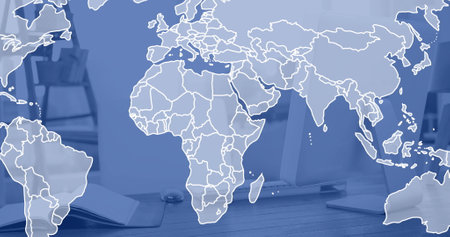 Image of world map and digital data processing over desk in office. Global connections, computing and data processing concept digitally generated image.