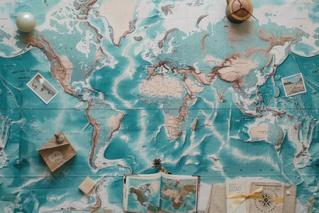 Travel photos displayed on an illustrated world map create a nostalgic atmosphere for wanderlust and exploration.