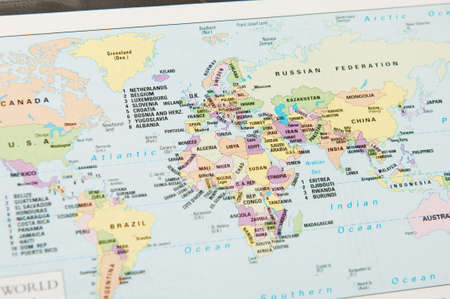Close-up of a world map with highlighted continents, sharp lines and bright contrast