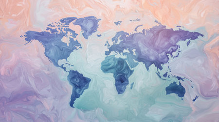 An artistic representation of the world map features swirls of pastel colors, highlighting the continents in pink and blue tones. This unique design captures both beauty and geography.