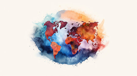 This vibrant abstract map showcases textured countries in bold colors against a teal background, representing global diversity and creativity in design.
