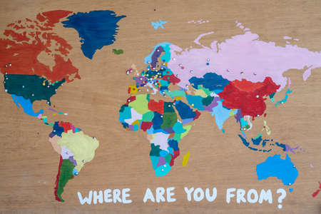 World map painted with multicolored paint on a wooden wall background and inscription where are you from