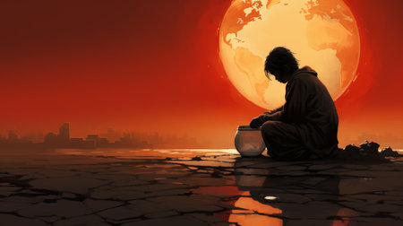 People sit with their heads down and hopeful in a dry land because of the drought there is no rain for a long time. Global warming and drought concept