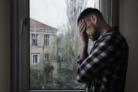 Upset man with picture of Ukrainian flag on cheek near window at home, space for text. Stop war in Ukraine