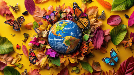 A stunning arrangement features the Earth at center, adorned with a variety of colorful autumn leaves and butterflies, set against a bright yellow background.