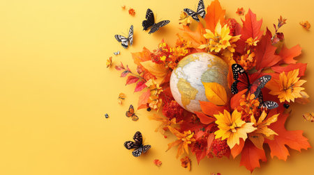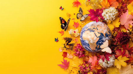 A captivating arrangement of autumn leaves, flowers, and butterflies encircles a globe against a bright yellow backdrop, celebrating seasonal beauty.