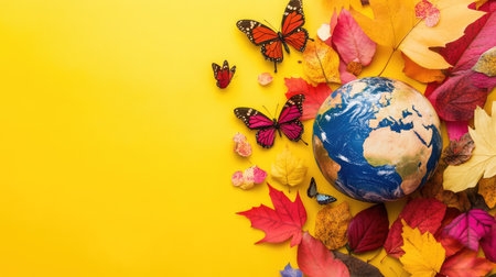 A captivating composition featuring a globe surrounded by vibrant autumn leaves and colorful butterflies on a bright yellow background, celebrating nature's beauty.