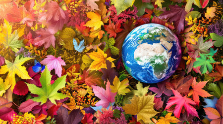 This captivating image features a globe surrounded by a rich tapestry of colorful autumn leaves, symbolizing environmental diversity and seasonal change.