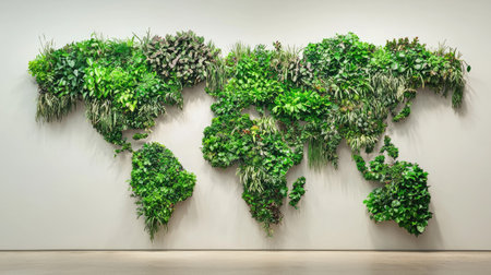 This striking wall art features a world map crafted from various lush green plants, creating a vibrant and eco-friendly focal point for any modern space.