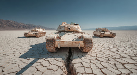 Armored military tanks are positioned on a cracked earth surface, surrounded by a dramatic sky and distant mountains, highlighting strength in a desolate landscape