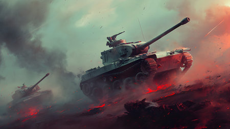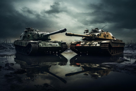 Massive Two war tanks. Combat action. Generate Ai