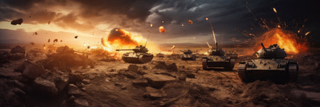 Tank advancing through desert battlefield with smoke and explosions - military power and warfare