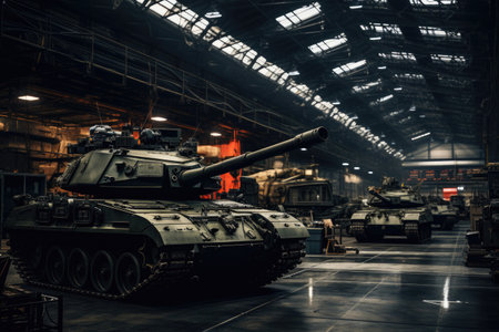 Rows of armored tanks are meticulously assembled in a spacious military factory. Bright overhead lights illuminate the sleek machinery, emphasizing precision and efficiency in production.