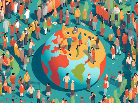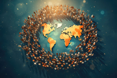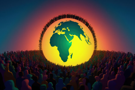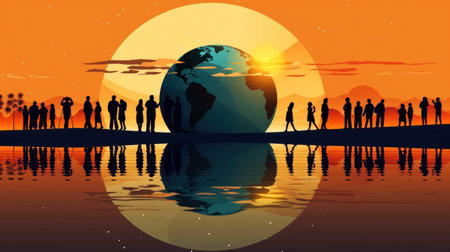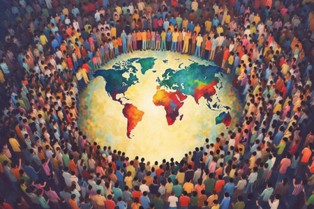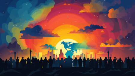 Large crowd gathers around glowing globe, symbolizing unity and global awareness. scene captures moment of connection among diverse individuals, emphasizing importance of community