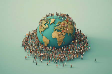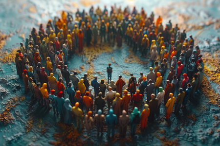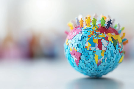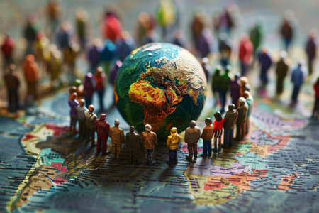 Miniature figures gather around a textured globe, symbolizing global diversity and interconnectedness.