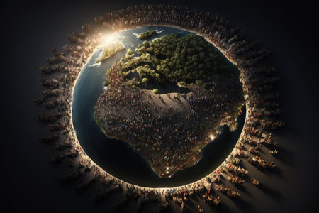 Earth globe planet with many people around. Overcrowded Earth. Overpopulation concept. Generative AI