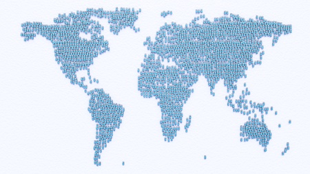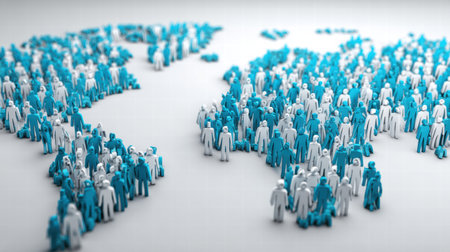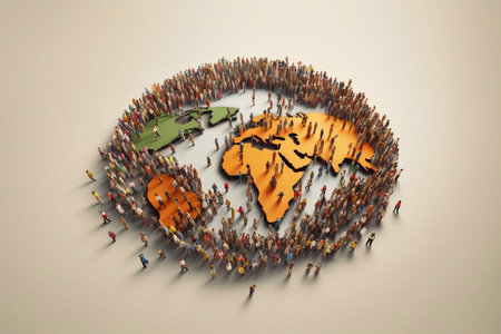 An aerial view shows a vast crowd of people forming the shape of planet Earth with continents, symbolizing global population, interconnectedness, and humanity's collective presence.