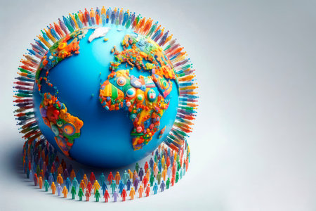 A colorful illustration depicting a diverse group of people standing around a globe, representing global unity and diversity.