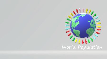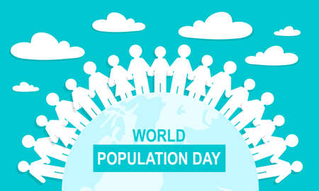 Vector illustration,banner or poster of world population day. People circled around blue Globe. White Background.. For web design and application interface, also useful for infographics. Vector illustration.