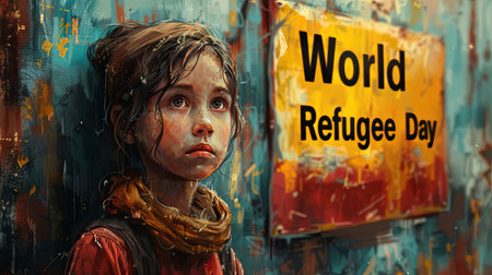 Moving digital illustration of a young girl with a poignant expression stands beside a World Refugee Day sign, highlighting the emotional impact and human aspect of global displacement.