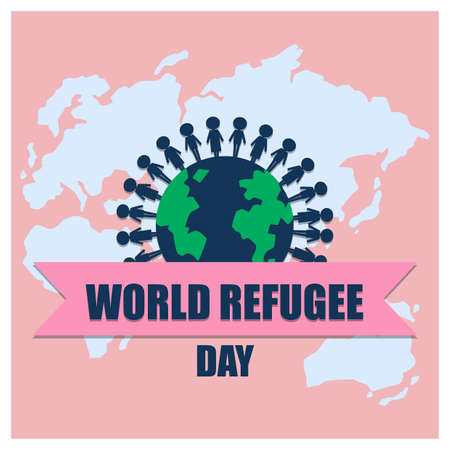 World Refugee Day banner with people around globe on world map background illustration