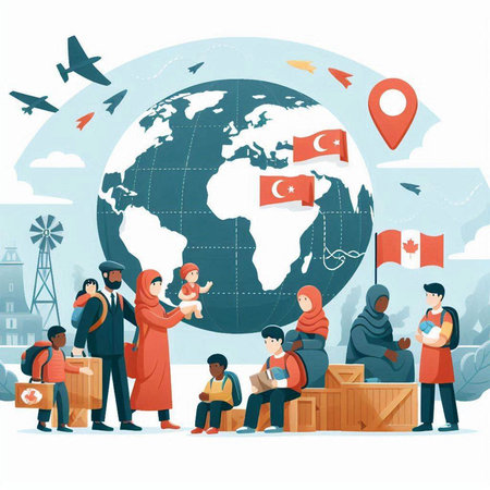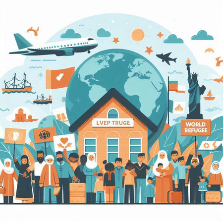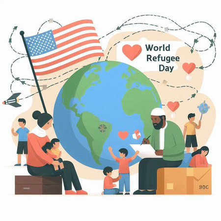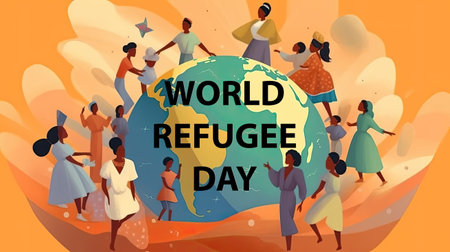 Illustrative representation of a globe with refugees and the text World Refugee Day to commemorate and honor refugees around the world. (Generative AI)